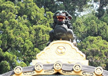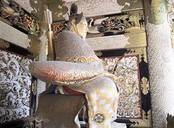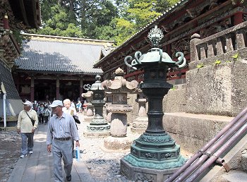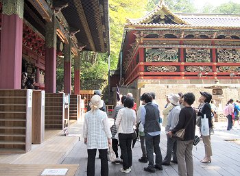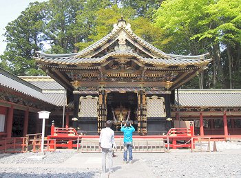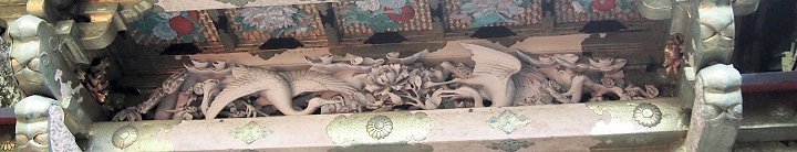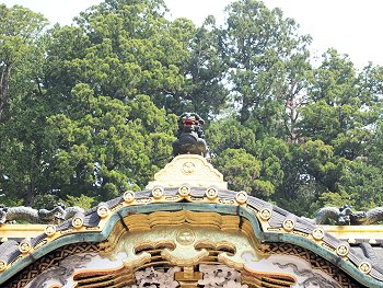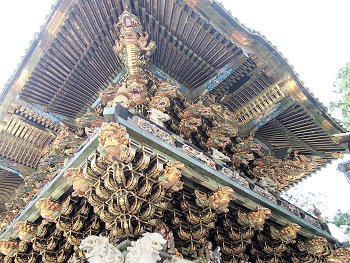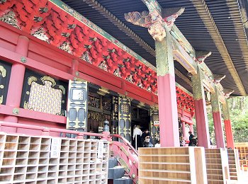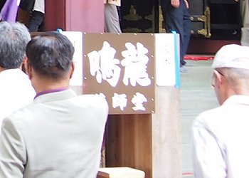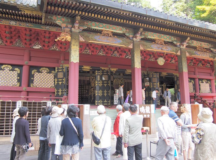 ●鳴竜(なきりゅう)34枚のヒノキの天井板に描かれた、縦6メートル、横15メートルの鳴竜鼓楼の後ろにある建物は、本尊が薬師瑠璃光如来(やくしるりこうにょらい)(薬師如来)であることから「薬師堂」、また乱世を鎮めた家康公が薬師如来の生まれ変わりと考えられたので、本来の仏(本地-ほんじ-)をまつったことから「本地堂」と呼ばれる。本地堂(薬師堂)の内陣天井に描かれているのが、有名な鳴竜。竜の頭の下で拍子木を打つと、天井と床が共鳴して鈴のような鳴き声に聞こえる。