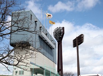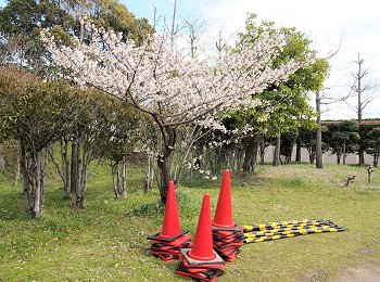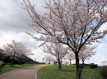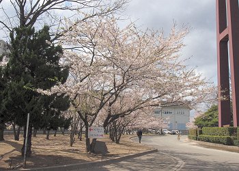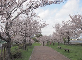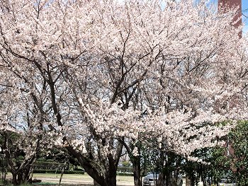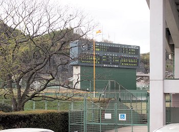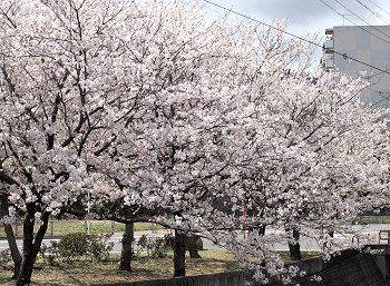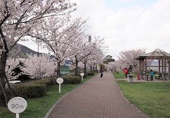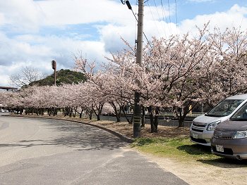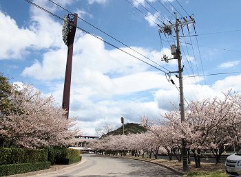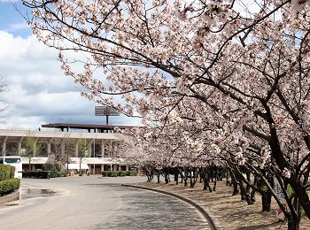 スコアボード裏を見上げてみますと、フラッグの激しい揺れで風の強さが一目瞭然。上空ほど一層風が強かったのかも分かりません。球場裏から陸上競技場に向かいます桜並木も大変キレイ。