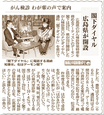 これは、5月20日の中国新聞朝刊の記事ですけど、ふ〜ん、デーモン小暮sanは「広島県のがん検診啓発特使」を務めておられたのですか…
