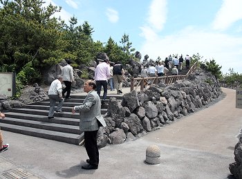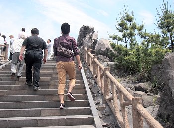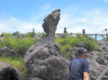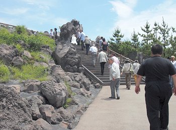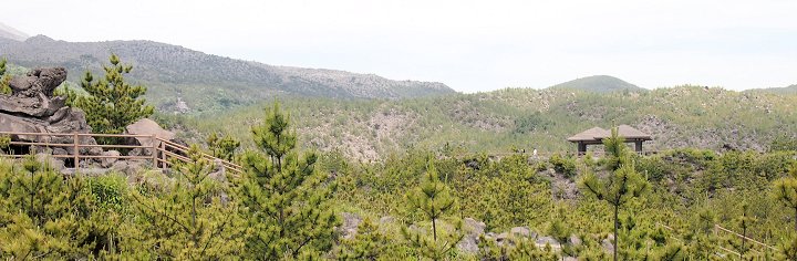 鹿児島港から桜島フェリーで桜島港に渡り、林芙美子文学碑を左に見ながら有村溶岩展望所に直行です。◆桜島桜島(さくらじま)は、鹿児島県の鹿児島湾(錦江湾)にある東西約12km、南北約10km、周囲約55km、面積約77km2の火山島。かつては文字通り島であったが1914年(大正3年)の噴火により大隅半島と陸続きとなった。御岳(おんたけ、別称:桜島北岳)と呼ばれる、約2万6千年前に鹿児島湾内の海底火山として活動を開始した活火山によって形成された、地質学的には比較的新しい火山である。有史以来頻繁に繰り返してきた噴火の記録も多く、現在もなお活発な活動を続けているため、学術的にも重視されている。