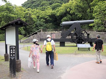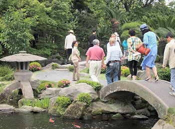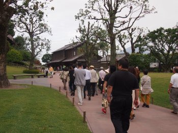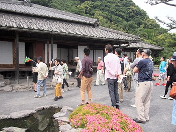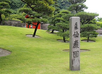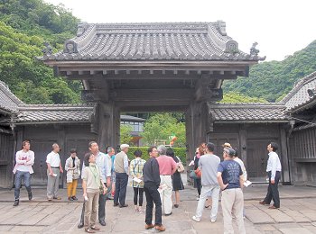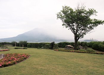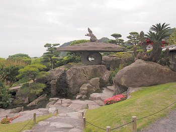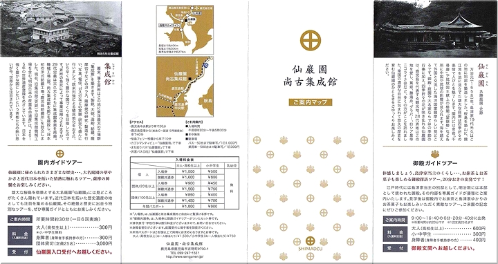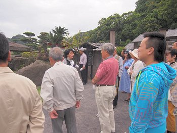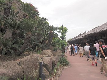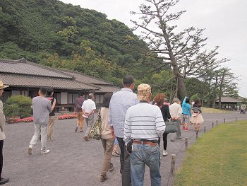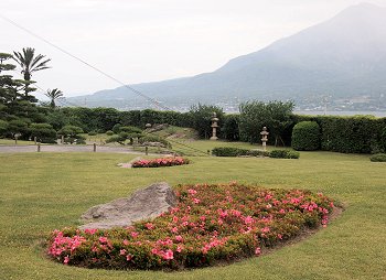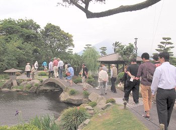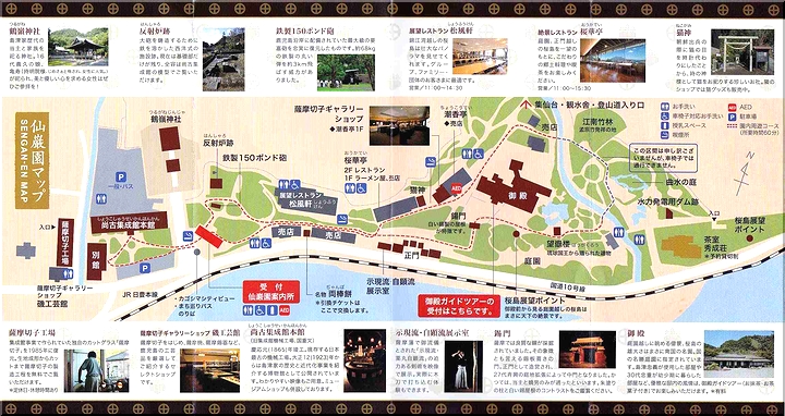 城山公園を後にしますと、今回の研修旅行最後の訪問先であります「仙巌園」にと向かいます。◆仙巌園仙巌園(せんがんえん)は鹿児島県鹿児島市吉野町字磯にある薩摩藩主島津氏の別邸跡とその庭園。別名磯庭園(いそていえん)。敷地面積は約5ha。◆概要1658年(万治元年)に第19代当主であった島津光久によって造園され、その後も歴代当主による改築が重ねられてきた。借景技法を用い、桜島を築山に、鹿児島湾を池に見立てた素晴らしい景色と広大な庭園が特徴で、1958年(昭和33年)に国の名勝に指定された。幕末には第28代当主島津斉彬がこの敷地の一部を使ってヨーロッパ式製鉄所やガラス工場を建設するなどの近代化事業(集成館事業)を起こした。1857年(安政4年)には、園内の石灯籠にガス管をつないで点火させ灯火として用いたことから、日本のガス灯発祥におけるルーツの一つとして挙げられる場所にもなっている。1888年(明治21年)からは焼失した鹿児島城に代わり島津忠義公爵一家の住まいとなっていたが、忠義の死後に跡を継いだ島津忠重は薩摩藩出身の新政府高官らによって東京市に移住させられ、仙巌園も住人不在となった。1949年(昭和24年)、華族制度廃止に伴い鹿児島市の管理下に置かれたが、1957年(昭和32年)には島津家に返還され、現在は島津興業が管理している。春の曲水の宴や江戸時代の作法に則って行われる端午の節句、七夕の展示、初冬に行われる草鹿式などが有名。