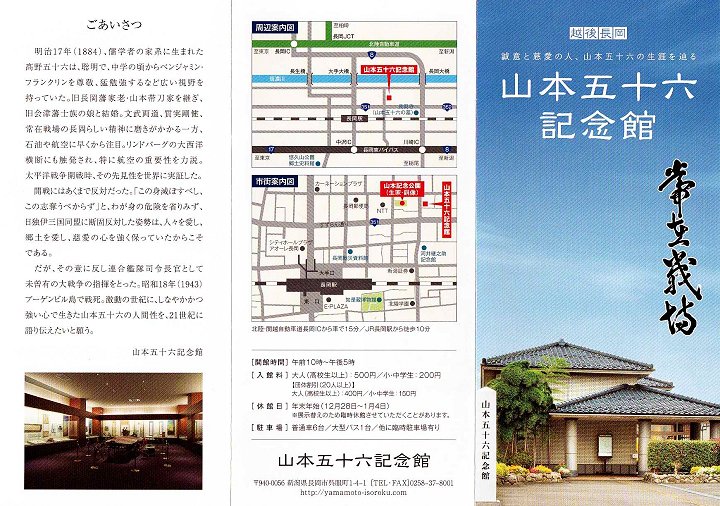 しかし、その意に反し連合艦隊司令長官として未曽有の大戦争の指揮をとることとなり、昭和18年(1943)ブーゲンビル島で戦死しました。この記念館は激動の世紀に、しなやかかつ強い心で生きた山本五十六の人間性を、21世紀に語り伝えたいと願う人々の手で建設されました。・所在地 -- 長岡市呉服町1丁目4番1号