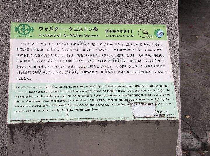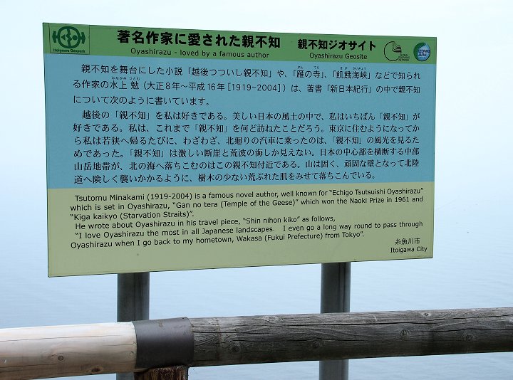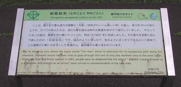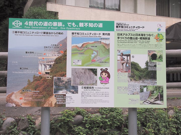 親不知・青海の間を「子不知の難所」、親不知・市振の間を「親不知の難所」と呼び,北アルプスの北端がガクッと日本海になられ落ちて、古来より北陸道の最大の難所として知られている。両側に断崖と荒波が迫り,旅人が危険を冒して通過したといわれ、幾多の遭難悲話を伝えている。