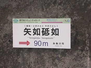 明治16年、ここに国道が開かれたのを記念しており、当時の青海村長・富岡磯平の書といわれている。