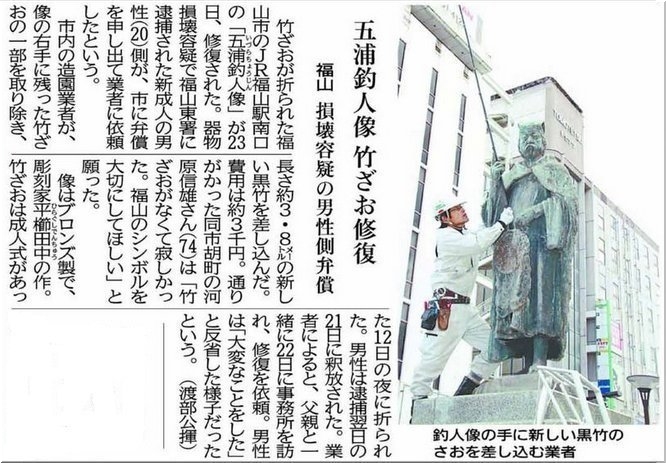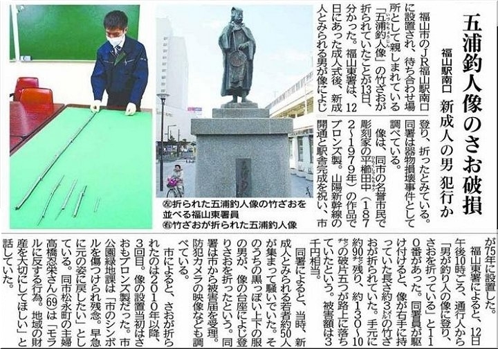 そぅそぅ、今朝(1/14)の中国新聞には「五浦釣人像の竿破損」の記事掲載がありました。心ない方がおられるものです。