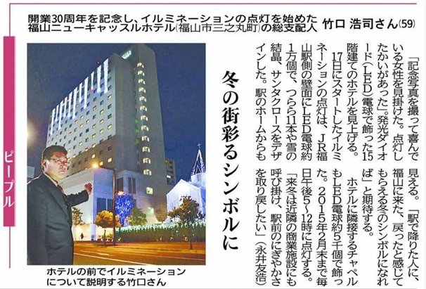 職場の忘年会はP.M.7:00からですから、まだもぅ少し時間がありますので、11/21付けの中国新聞に記事の掲載がありました福山ニューキャッスルホテルのイルミネーションを観てみようと、福山駅方向にと向かう事となりました(^.-)☆