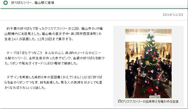 ここには、福山暁の星女子中・高の生徒24人の手によります約1,000個の折りばらで彩ったクリスマスツリーが(^_^)v