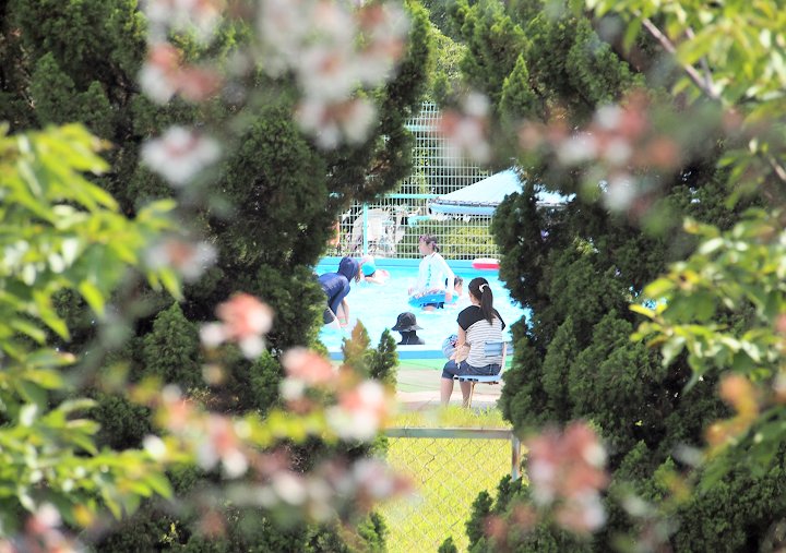 観戦後、竹ヶ端運動公園内の市営プール脇を歩いて帰っておりますと、プール内が実に賑やか。