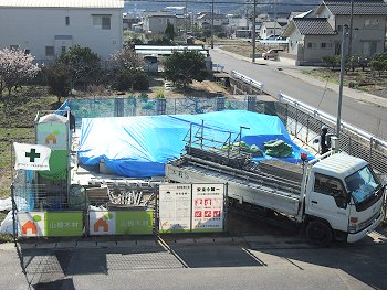 挿入の画像の、上段・左は3/21の夕方、そして、上段右は3/23の早朝に撮りましたものなんです(^.-)☆3/22(土)、GONsanは勤務ですから、A.M.7:40頃、我が家の外に出ますと業者の方々、そして施主ご家族が集まっておられました。