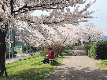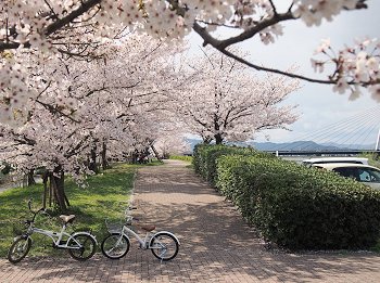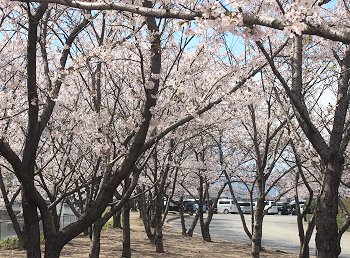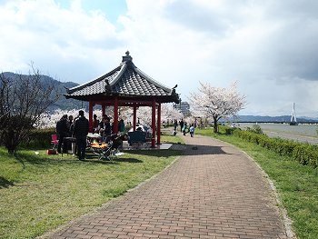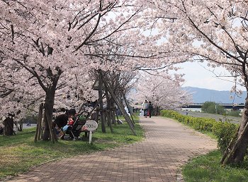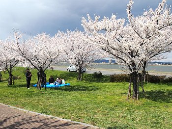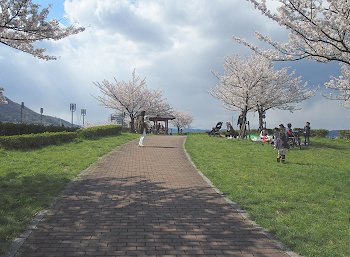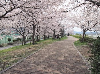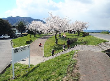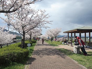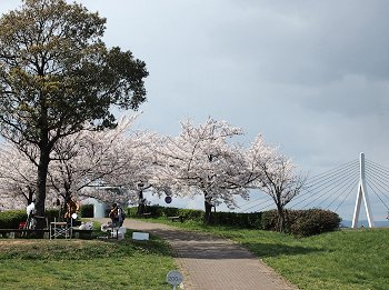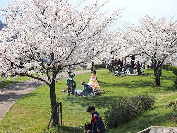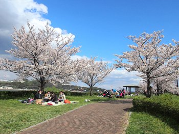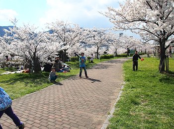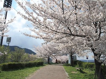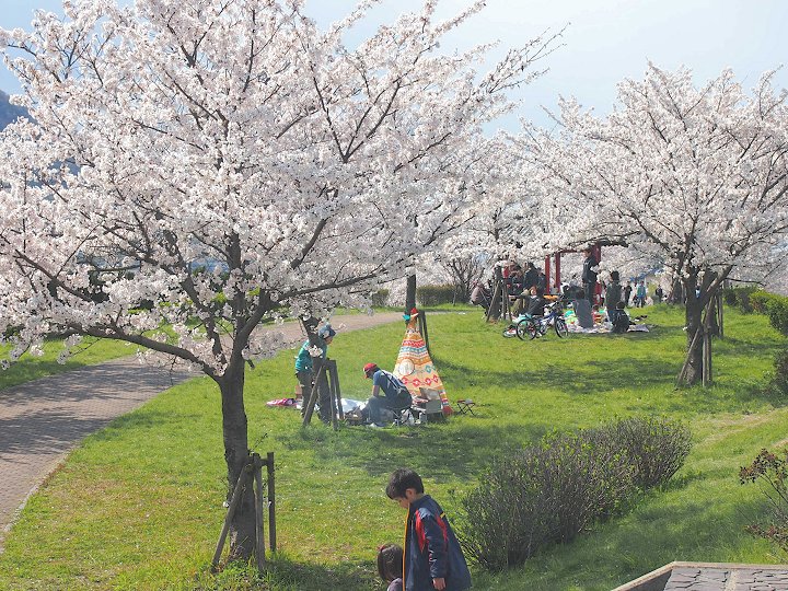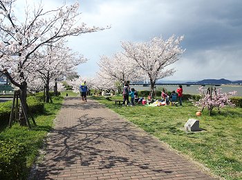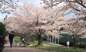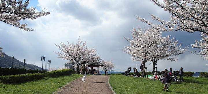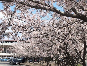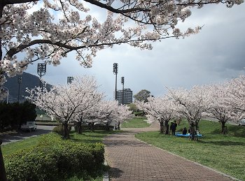 球場内も応援等で賑やかそうでしたねぇ〜ウォーキングロードのスタート地点まで進んで来ますと、満開のサクラの下ではご家族連れ・若者のグループ等で大変賑やか(^_^)v