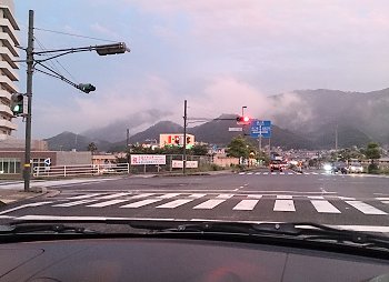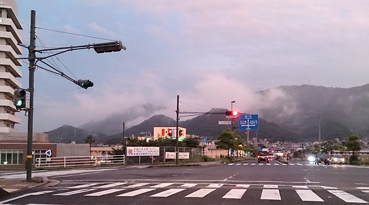 入江大橋を渡っておりますと、我が家方向・沼南アルプスの中腹に真っ白い濃霧がかかっておりました。