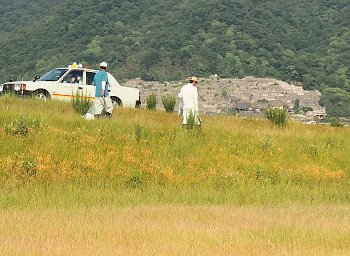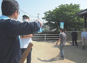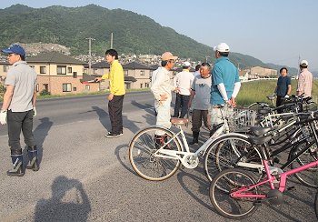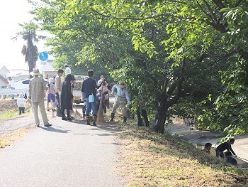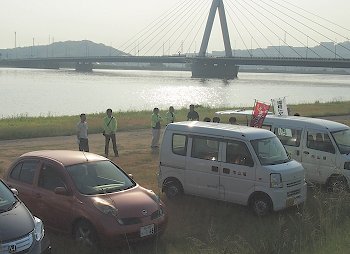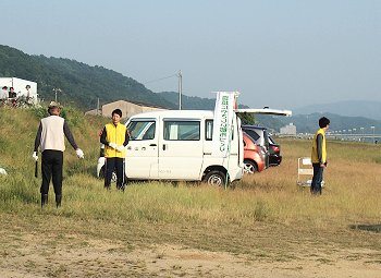 A.M.8:00から実施されます市民グループの皆様が河川敷に次々と集合して来られます中、私達は約40分程度で終了。