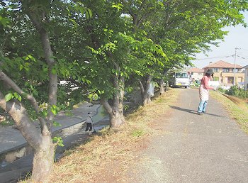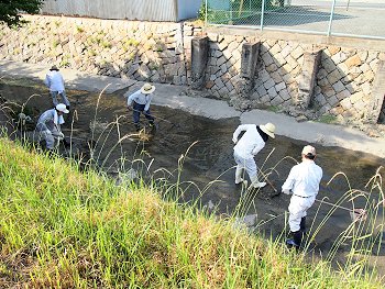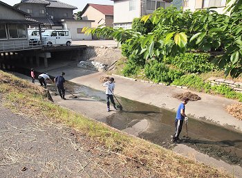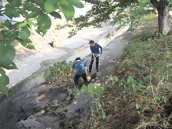 我が町内の皆様は、A.M.8:00から開始となってはおりましても取り掛かりが随分早いですから、5分前には家を出ましたGONsanですけど、案の定、集会所裏を流れます水呑川に出かけますと既に始めておられる方が数名。
