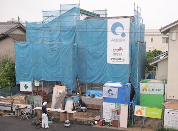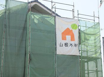 左のお宅の足場も外され、2棟ともスッキリとした全貌が拝見出来るようになりましたけど、竣工を目前にされました右のお宅に、また足場が組まれ防護ネットもセット。