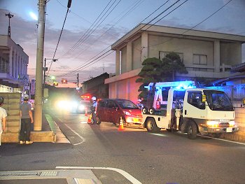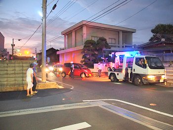 眼を合わせますと、「相変わらずこんな場面では必ず片手にカメラですねぇ〜」と言いたそうにニタッ(^-^)ですから、苦笑のGONsan。それにしましても地元消防団の皆様にしては、実に速い現場到着。