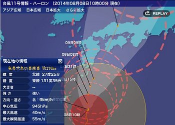 2014/08/08 19:28 発表の台風情報ですけど、動き遅く大雨警戒強い勢力の台風11号は、あす朝に種子島屋久島地方へ最接近の後、10日午前にかけ西日本に接近し縦断する見込みです。