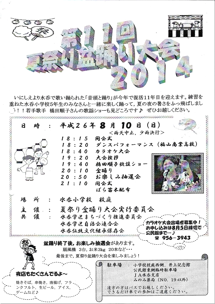 福山市内では、先週の土・日曜日に各町内の夏祭り・盆踊り大会が開催されましたところが多かったようですけど、明後日の夜は、我が町の「夏祭り盆踊り大会」なんです(^.-)☆