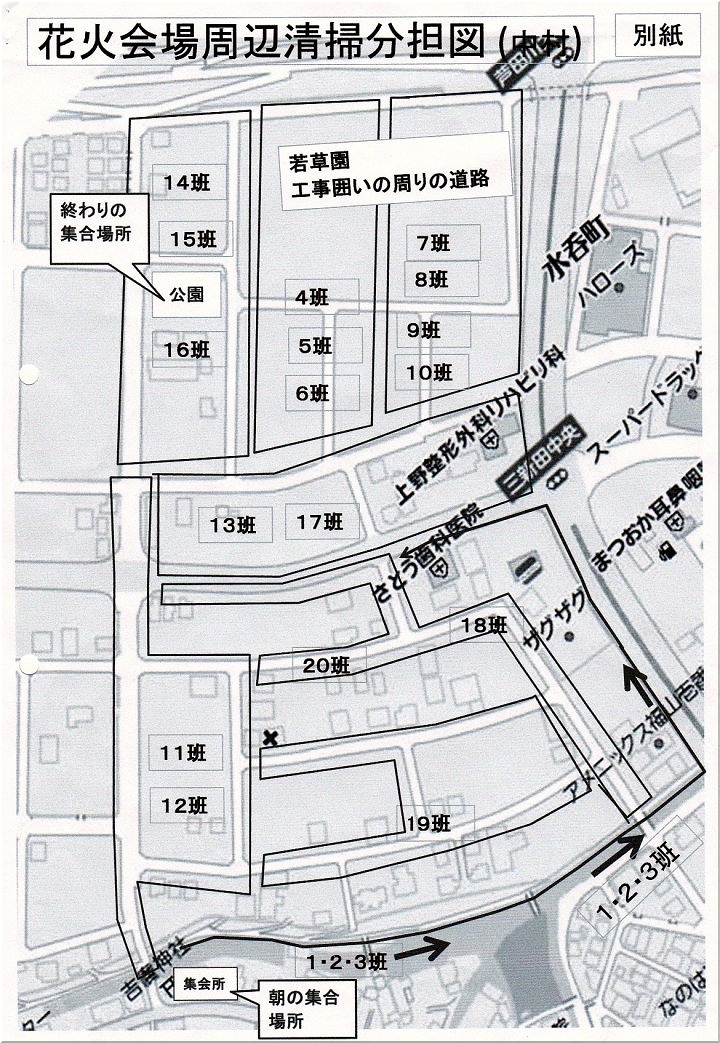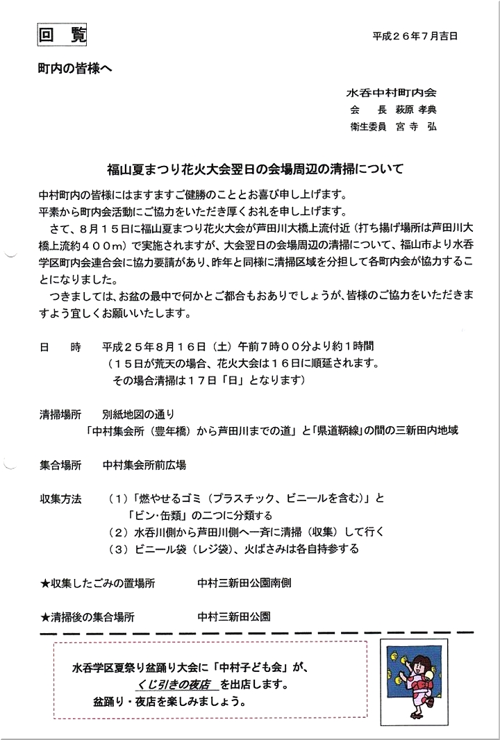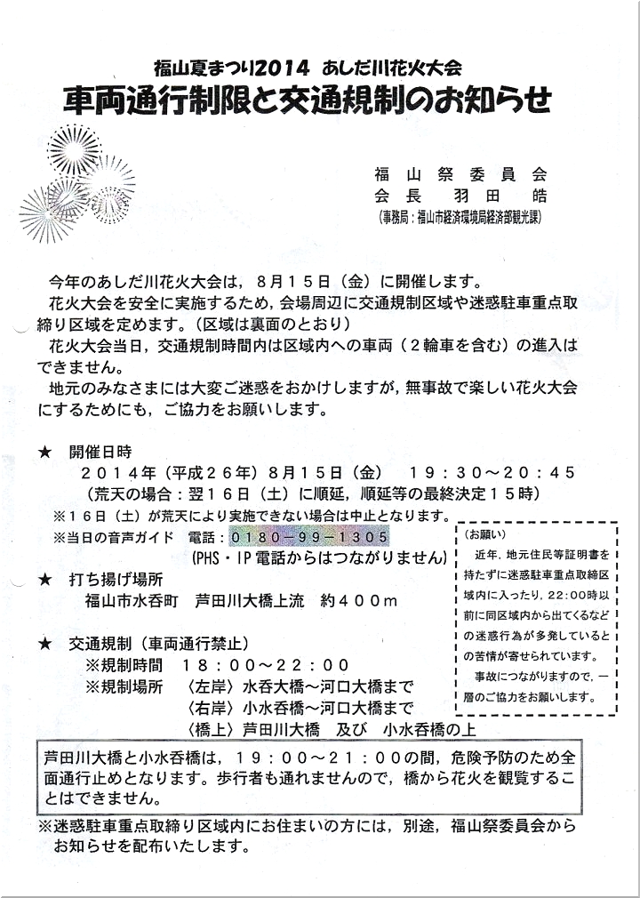 これも、もぅ随分前ですけど町内会の回覧で廻っておりました花火大会当日のお知らせです。
