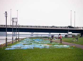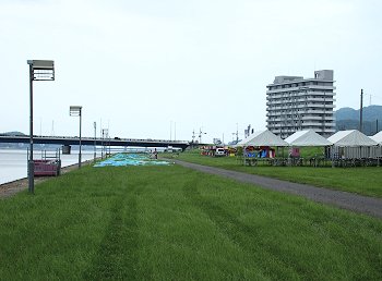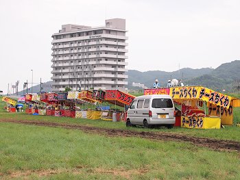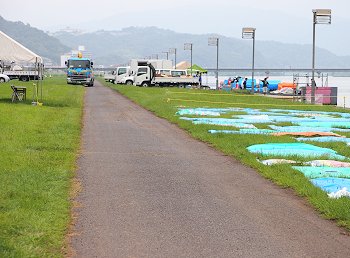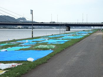 河川敷では、場所取りの方々のブルーシートが敷かれておりました。