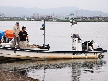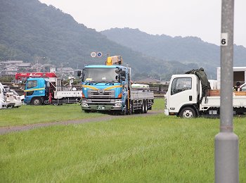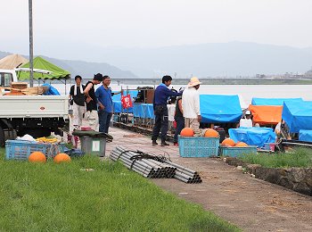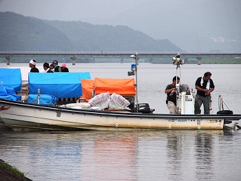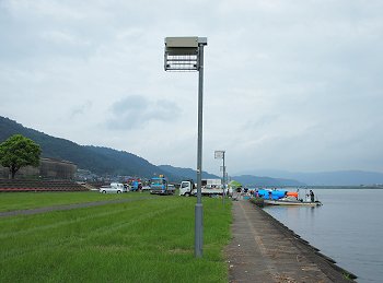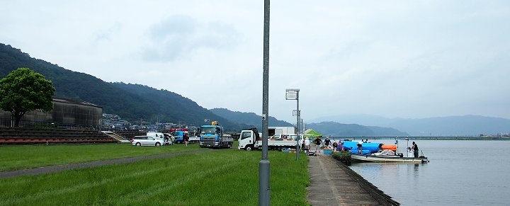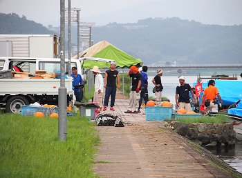 花火打ち上げ場所近くの河川敷では、京都から来られました業者の皆様の準備が順調に進行中。