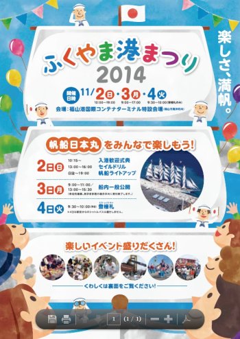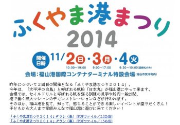 11/2(日)〜11/4(火)(4日は登檣礼のみ)に、福山港国際コンテナターミナル特設会場にて「ふくやま港まつり2014」が開催。