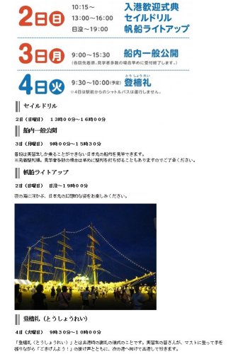 ふん、ふん、出かけましたら11/2(日)〜11/3(月)間で楽しめそうですネ(^_^)v今まで海上からの船上で「海王丸」は眺めていますGONsanなんですけど、「日本丸」は未だに拝見します機会には恵まれておりませんでした。