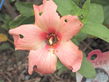 我が家近くの畑で眼が止まりました景観です(^.-)☆畑の脇を歩いておりましたら、葉の部分が囓られまして穴のあきました花につぃパチリ(^-^)