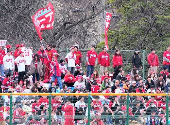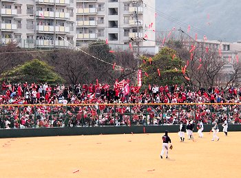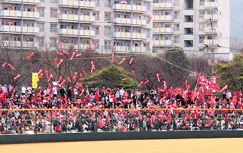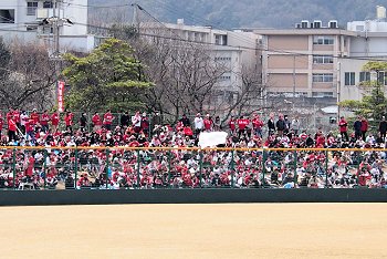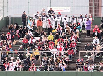 この話題はさて置きまして、1塁側のスタンドに眼を移しますと、「福井優也先輩、がんばれ!!」の文字が…◆福井 優也福井 優也(ふくい ゆうや、1988年2月8日-)は、広島東洋カープに所属するプロ野球選手(投手)。岡山県英田郡西粟倉村出身。西粟倉小学校3年からソフトボールを始め、この頃からプロ野球選手になることだけを考えていた。夏は野球、冬はクロスカントリーに明け暮れる生活を送っており、全国大会に出場した経験も持つ。西粟倉中学校では兵庫県の硬式野球チーム「佐用スターズ」に入り2年から投手。2003年、野球部監督の上甲正典を慕って愛媛県の済美高校に入学。1年秋からエースになり、同年11月の明治神宮野球大会東北高校戦で2安打完封勝利(7回コールド)を挙げる。2004年の春のセンバツでは「やればできる」を合言葉に、大会史上初の「ナイターでの決勝」で愛工大名電に勝利し、創部2年での甲子園初出場初優勝の主力選手となった。同年の夏の甲子園では準決勝までの4試合で先発完投した。決勝の駒大苫小牧戦では、風邪による体調不良が心配されたが、自ら登板を志願した。強打の駒大苫小牧に打撃戦で敗れ、春夏連覇を逃した。大会後には日米親善高校野球のメンバーに選出された。翌年の夏の甲子園でも1勝をあげ、甲子園通算勝利9勝となった。高校の一学年上に鵜久森淳志がいる。2005年の高校生ドラフト会議では読売ジャイアンツに4巡目で指名され、一旦は入団の意思を表明したがその後拒否。なお巨人からドラフト指名された選手の入団拒否は1980年4位指名の瀬戸山満年以来25年ぶり。進学にあたっては、卒業後プロ入りできず社会人に進む場合には早稲田大学か慶應義塾大学が有利と考えるなか、早大野球部監督の應武篤良に「早稲田一本で来るなら取る」と言われ、またドラフト前から誘われていたことなどから最終的に早大を志望した。しかし、推薦入試の締め切りに間に合わず、一般受験も不合格となる。多くの大学から声が掛かったが結局浪人し、鳥取市内のトレーニング施設ワールドウイングに通って勉強とトレーニングに励んだ。福井は「高校で酷使した肩を休めることもでき、充実した1年だった」と語っている。2007年、早稲田大学スポーツ科学部トップアスリート選抜入試に合格。斎藤佑樹、大石達也らと同期で推薦入学し、野球部に入部。斎藤とともに2人の甲子園優勝投手は将来のダブルエースとして期待された。福井は後に「斎藤と大石は目標であり自分を満足させなかったライバル。自分は3番目」と語っている。1年春の東京六大学野球リーグ2戦目に先発登板するが3回途中でノックアウト、夏に右肩痛を発症しベンチ入りメンバーから外される。この頃はマウンド上での態度が悪く投球に悪影響を与えていたが、周りからの指摘で改めたことで冷静に投球できるようになったという。2008年5月31日、東京六大学野球春季リーグ早慶戦1回戦に4番手でマウンドに上がり、2回を打者8人1安打無失点に抑えリーグ戦初勝利。
