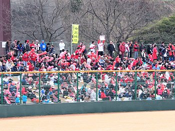 外野席の大半は、勿論、カープファンなのですけど、レフト側外野席の数ヶ所に熱心なヤクルトファンの方々もおられます。