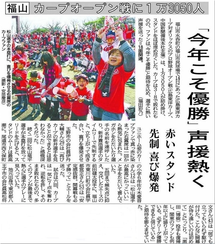 翌日の中国新聞には、この試合の様子が掲載されておりましたけど、カープファンの想いはただ一つ『今年こそ優勝!!』。 本当に久しく優勝から遠ざかっています広島カープ。 黒田投手が広島に復帰しました今年こそ、是非とも優勝して貰いたいものであります(^-^)//"