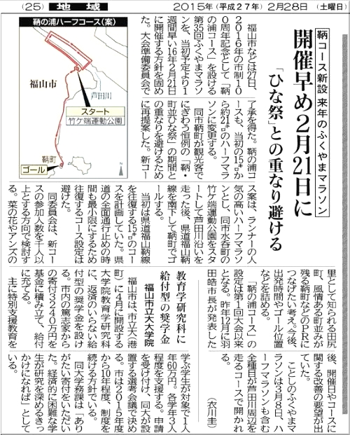 そして、もぅ随分前の同紙朝刊には、来年の「ふくやまマラソン」開催日は『2月21日』との記載。