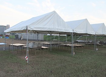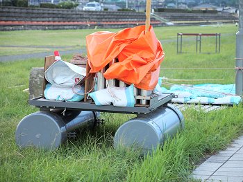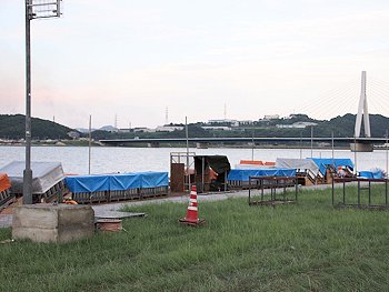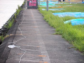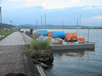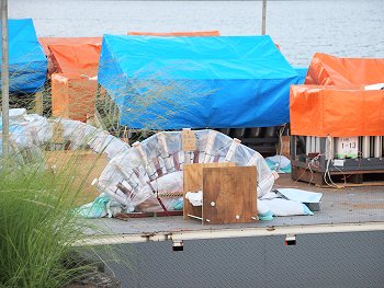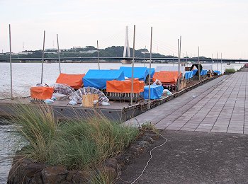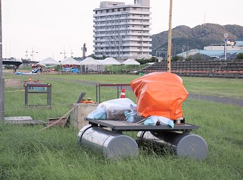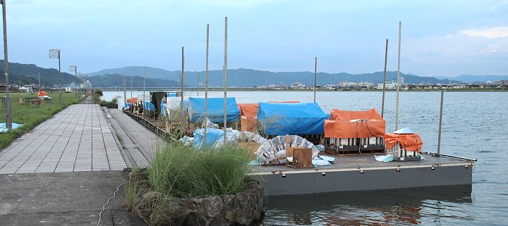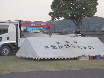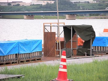 翌日の花火大会に備えまして、河岸際の台船には花火の筒が並びまして準備万端。