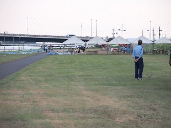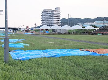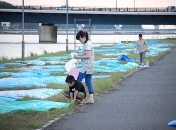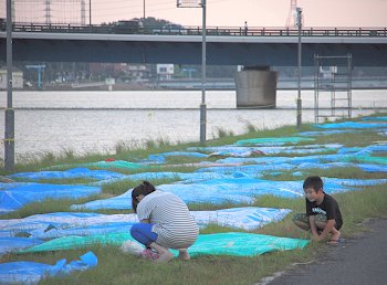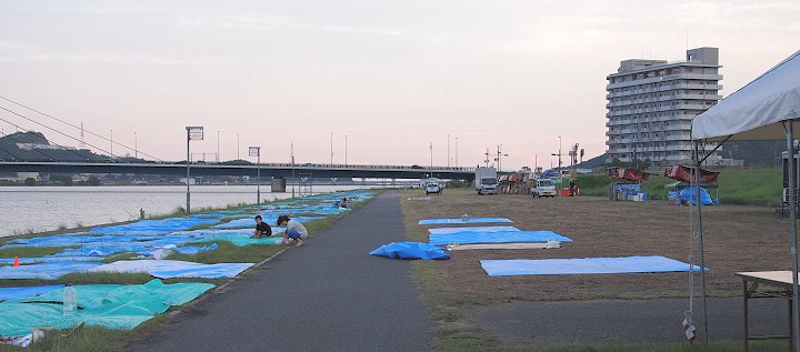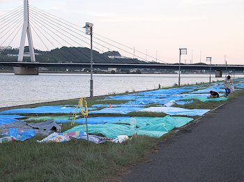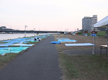 河川敷を見廻しますと、場所取りのブルーシートが結構並んでおりました(^.-)☆