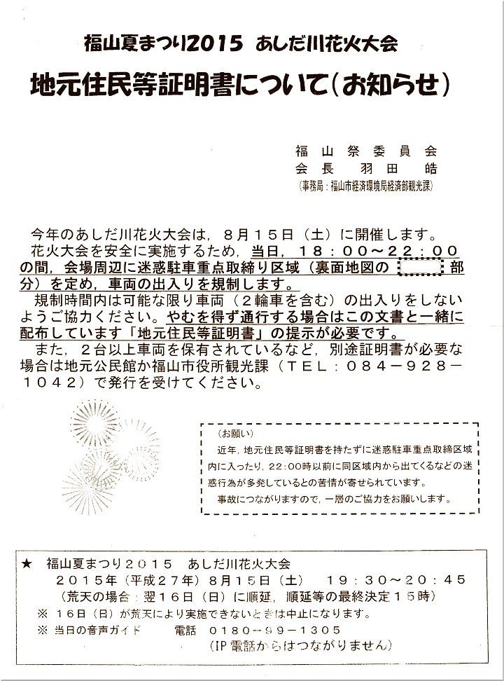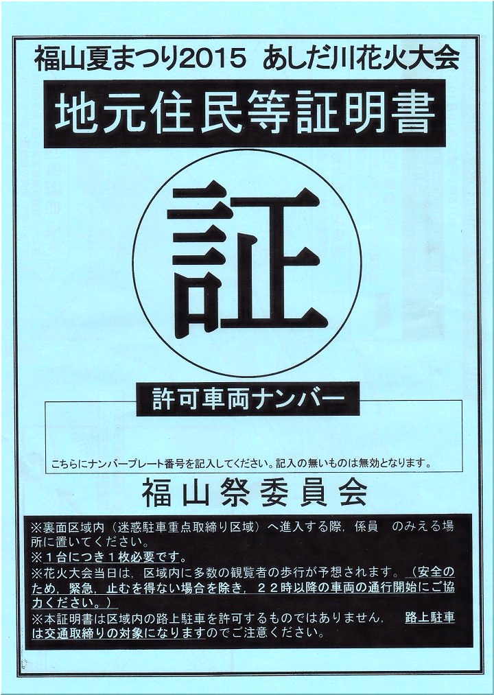 花火大会当日には、我が家周辺には走行制限が敷かれますから、こんな「地元住民等証明書」が所有台数分配布されます。