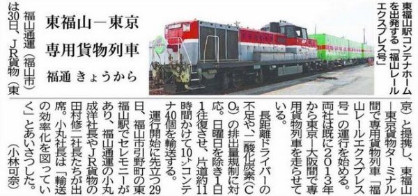 先日・3/30の朝刊でしたか…福山通運sanがJR貨物と連携し東福山〜東京貨物ターミナル間を11時間要し「福山レールエクスプレス号」の運行を開始する旨の記事掲載がありました(^.-)☆