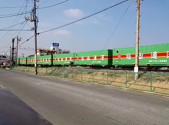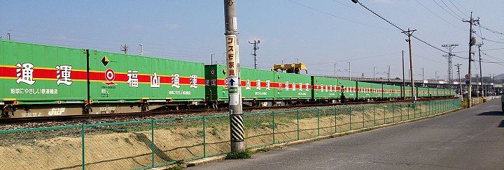 この「福山レールエクスプレス号」が、今から荷卸しされますのか、荷積み完了で今から東京に向け出発しますのかは分かりませんけど、ズラッと一直線に延びましたコンテナ列車。何度眼にしましてもイィものですネ(^_^)v