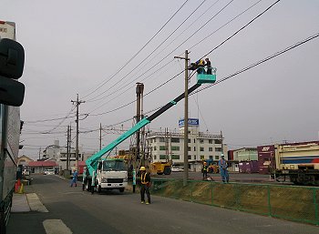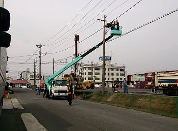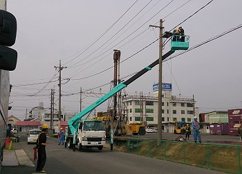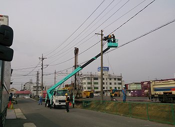 午前中の工事では、電柱に付いていた物は凡て取り除かれ、後は電柱を引き抜きますのみかと…