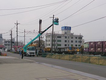 「福山レール エクスプレス号」の貨車は、この辺りまで最後尾がきますから、暗くて事故発生がありましても困りますので照明を明るくします工事でしたようですネ(^- ^;