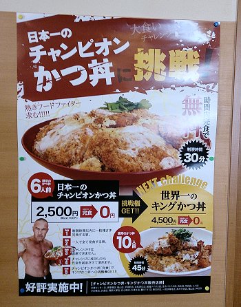 ポスターには、「日本一のチャンピオンかつ丼に挑戦、制限時間30分、時間内完食で2,500円⇒0円」の記載。