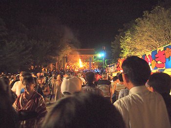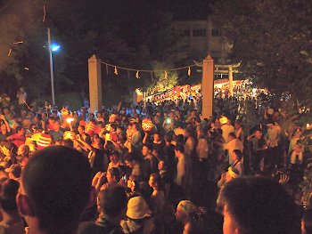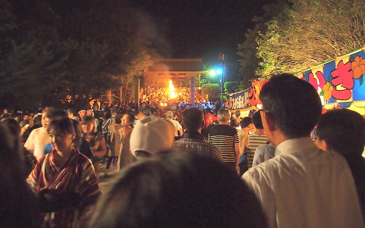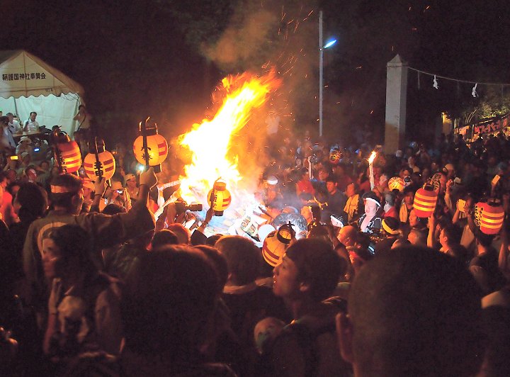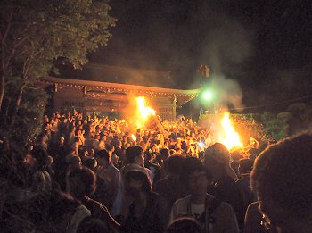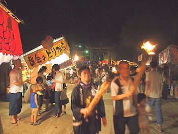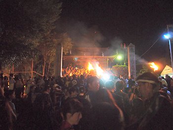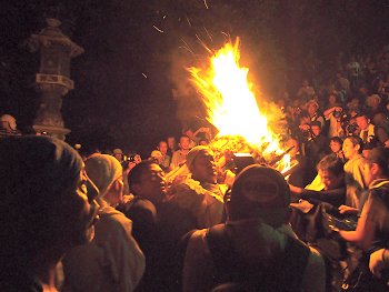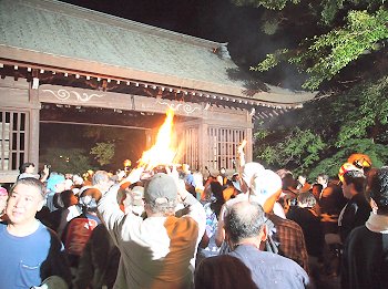 夏祭の神輿渡御の前夜、境内・町内の清祓、氏子・参拝者の病気厄払いとして斎行され、約150kgの大松明三体を、拝殿までの大石段を担ぎ上げる勇壮な火の祭典。福山市無形民俗文化財です。