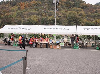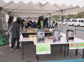 万田発酵郭anの構内に設けられた休憩所では、予約しておりました300円弁当を受け取り、お接待の皆様に準備して頂きました温かいソバを戴く事になりました(^_^)v