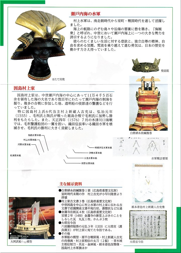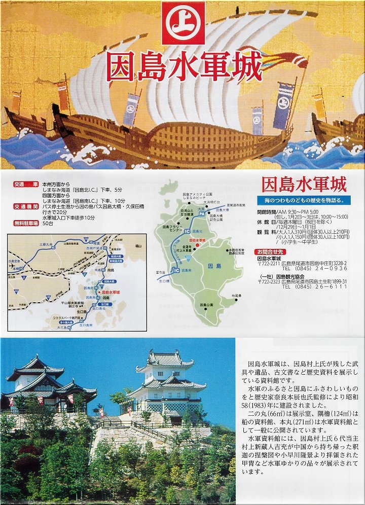 しまなみ海道の周辺は瀬戸内海の制海権を握っていた村上水軍の活躍したところです。能島村上家、来島村上家、向島村上家の三家が通行税の徴収や水先案内、海上警備を行っていました。戦国時代、因島村上家は毛利氏に臣従、毛利水軍の一翼を担い厳島の戦いなどで活躍しました。江戸時代には能島村上家とともに長州藩の船手組となったと言います。