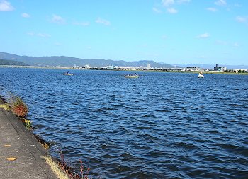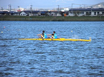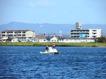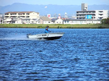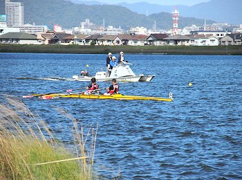 川面には競技委員の方が乗られましたモーターボート。その周辺にはレース前のウォーミングアップなのでしょうねぇ〜軽く練習しています艇も(^_^)v