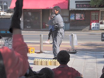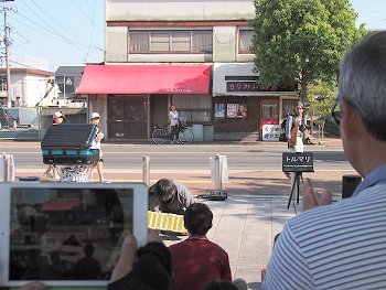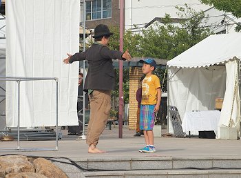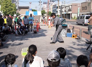 中央公園にと戻って来ますと、公園入り口では箱を使用しました大道芸が…