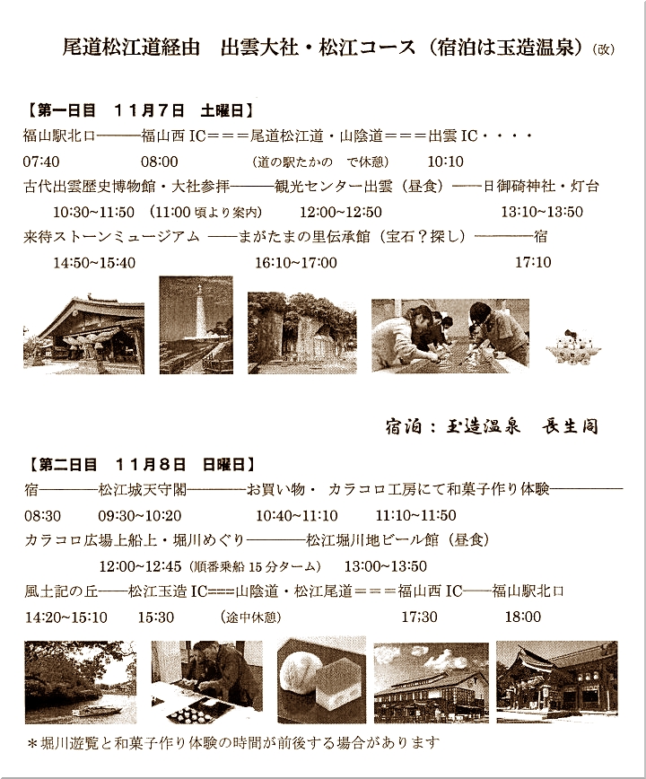 11/7(土)A.M.7:40に福山駅北口に集合で、A.M.8:00の定刻にバスで尾道松江道・山陰道走行での出雲行き(^-^)