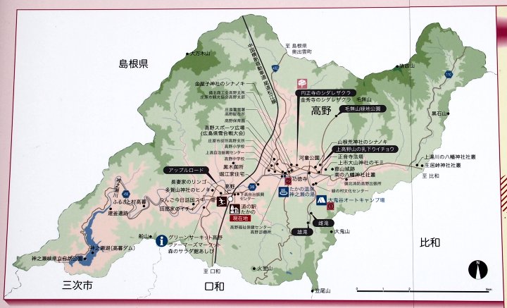 「道の駅たかの」は、中国山地のほぼ中央、中国横断自動車道尾道松江線のインターチェンジと主要地方道三次高野線が交わる場所に立地しています。