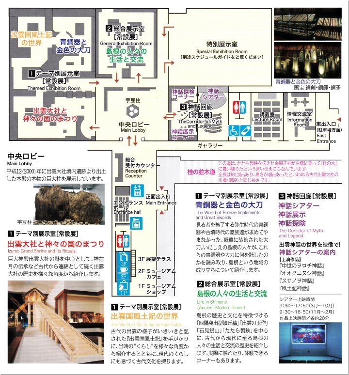 ・展示室 -- 神話回廊(神話シアター、神話展示コーナー、神話探検コーナー)、総合展示室、テーマ別展示室(出雲大社と神々の国のまつり、出雲国風土記の世界、青銅器と金色の大刀)、特別展示室