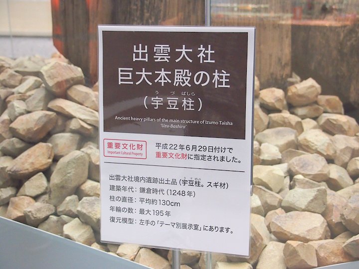 古代出雲以外では石見銀山など旧石見国も含めた島根県全体の歴史についての展示がある。中央ロビーには2000年に出雲大社境内から出土した宇豆柱が展示されている。