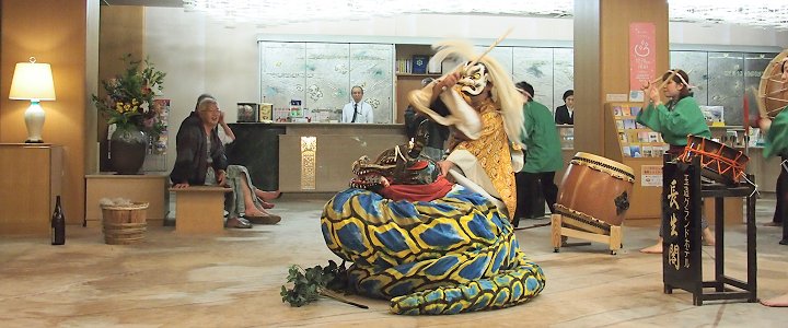 松江水郷祭湖上花火大会の際には島近くの台船から花火の打ち上げが行われる。
