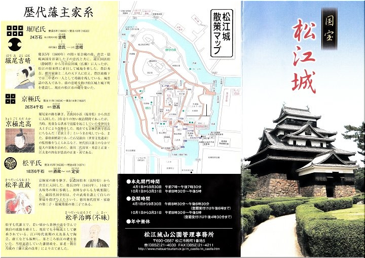 1634年(寛永11年) 京極忠高が若狭国小浜藩(若狭・越前敦賀郡)より出雲・隠岐両国26万石で入封。三の丸を造営し、ここに松江城の全容が完成した。